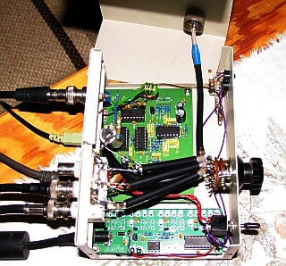 Hier noch einmal ein Blick in das Innere des Gerätes. Im Vordergrund die ELEKTOR Preselectorplatine (noch ohne Spulen)