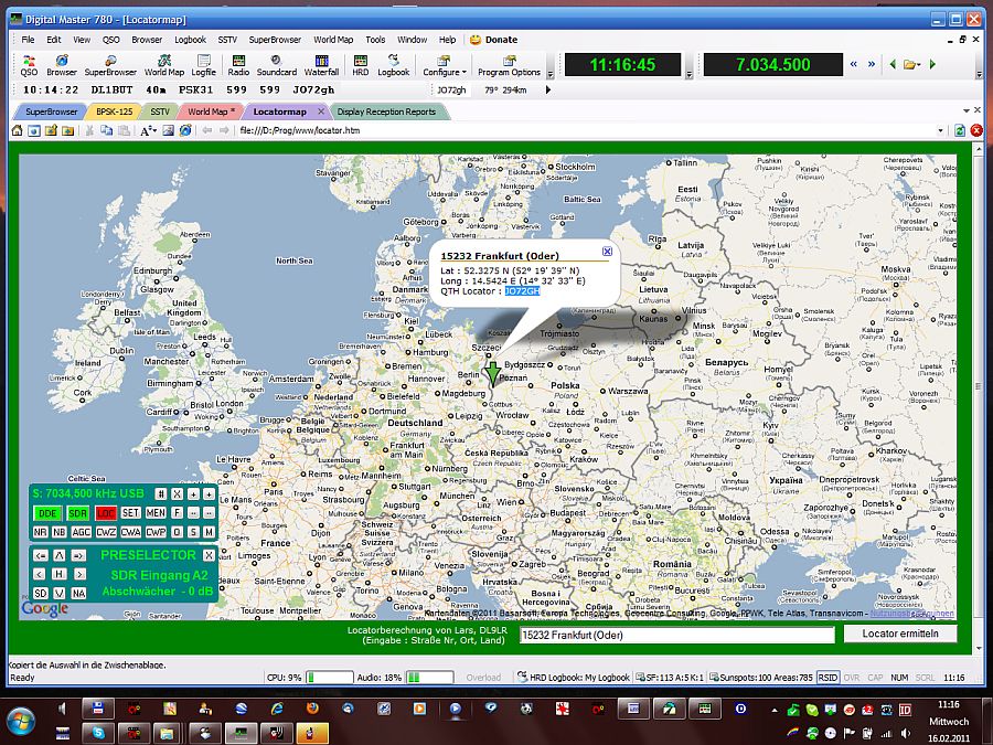 Zur Locatorermittlung der empfangenen Stationen läßt sich das Javascript von Lars (DL9LR) komfortabel in einer Browser-Registerkarte