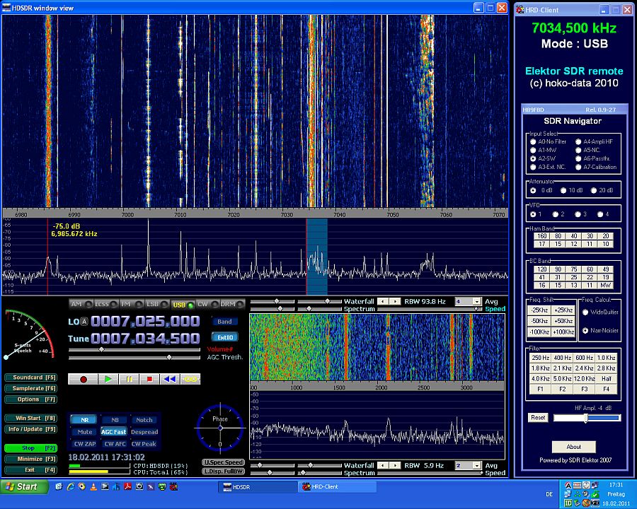 Hier ein Blick auf den Empfängerbilschirm in "Action". Betriebssystem: Windows XP pro SP3, Software: HDSDR mit ELEKTOR DLL, sowie