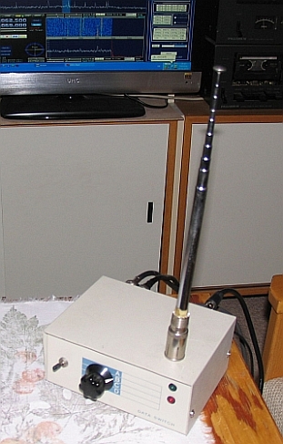 Dahinter das ELEKTOR SDR. Neben dem Antennenumschalter in der Frontplatte der Stromversorgungsumschalter sowie eine rote