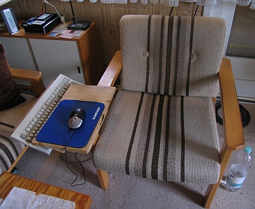 So läßt man sich das SWL-Leben gefallen. . . Die an der Sessellehne angebrachte Halterung für Maus und Tastatur
