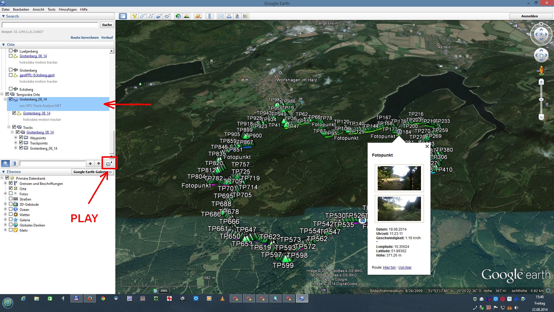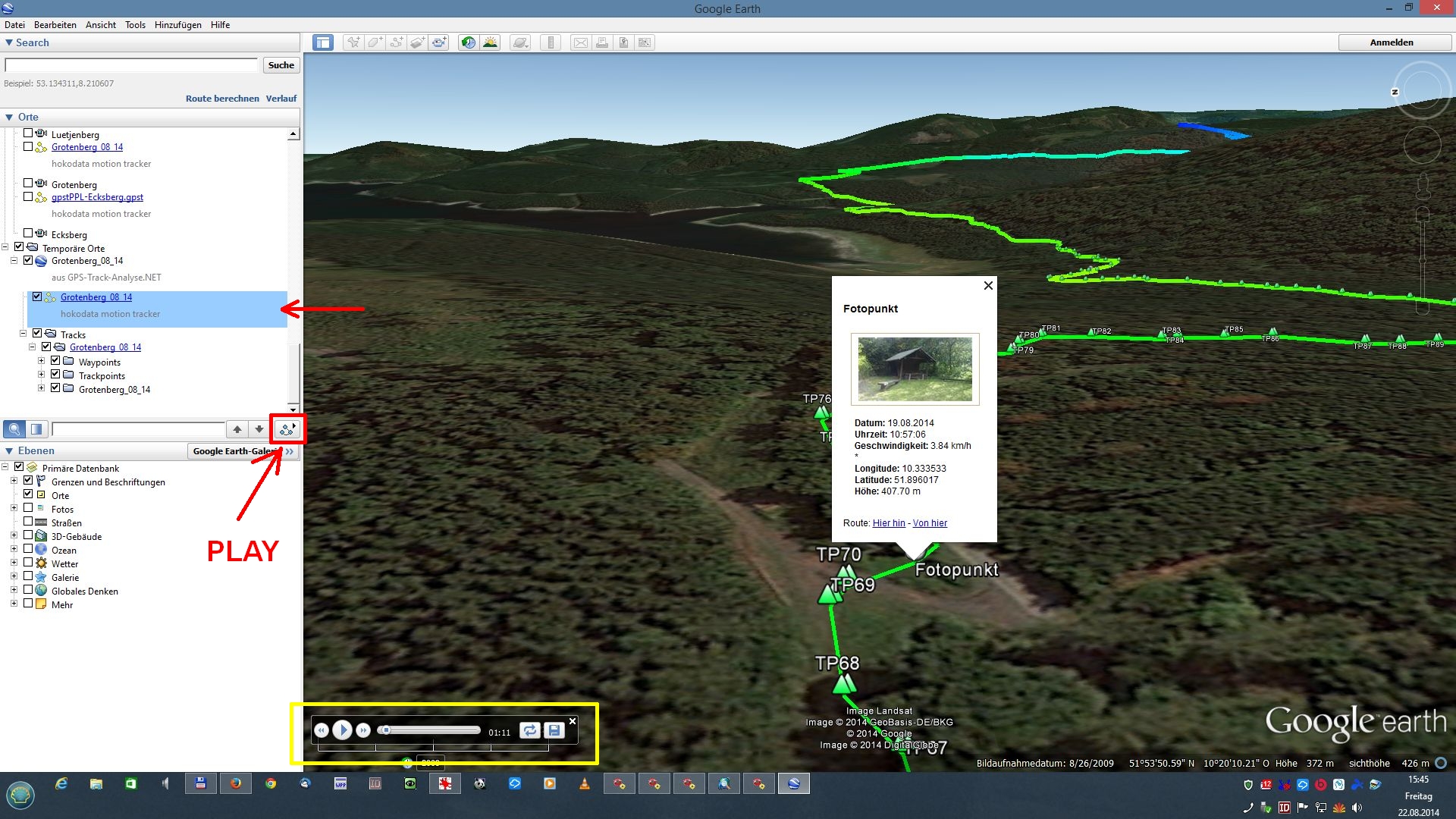 Tolle Eindrücke und Aussichten erlebt man, wenn man mit GoogleEarth's virtueller Kamera an den gewanderten Tracks entlangfliegt.