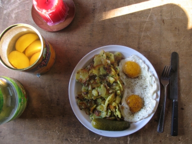 Bärlauchbratkartoffeln, Spiegelei, Spreewaldgurke Nachspeise Pfirsiche |