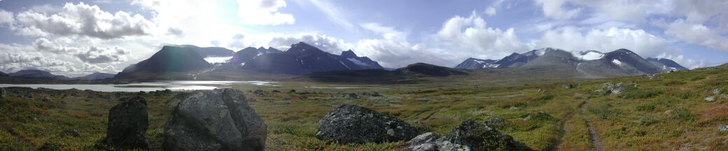 Internet verkraftet hätte, habe ich einmal etwas Anderes gemacht und ein Panoramabild vom Sarek zusammengebastelt.