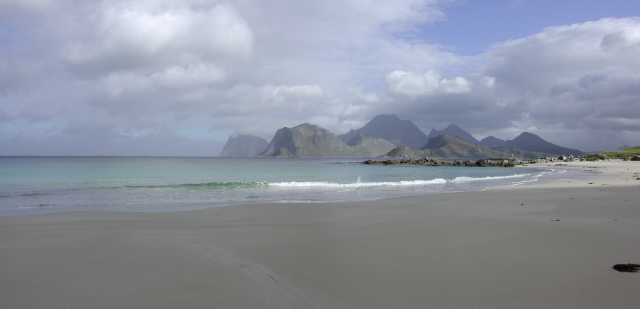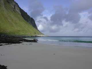 ![]() Menschenleerer, schneeweißer Sandstrand, das tiefgrüne, kristallklare Wasser und die tosende Brandung des Atlantik an der Westküste der Lofoten |