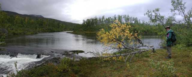 ![]() Im Stillwasserbereich des Flusses, oberhalb des großen Katarakts hat der Biber sein Reich. Eine von ihm frisch gefällte Birke am Ufer. |