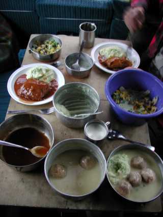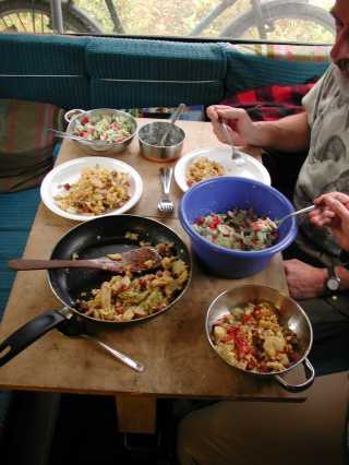 ![]() Unter der "Pilztrocknungsanlage" findet das gemütliche, gemeinsame Abendessen statt. |