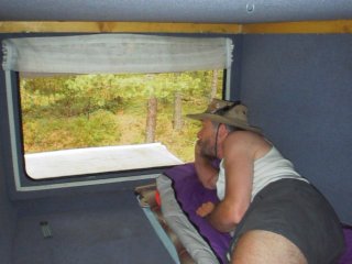 ![]() Hier wird gepennt: Die Schlafkabine mit großem "Aussichtsfenster" in der "1. Etage" |